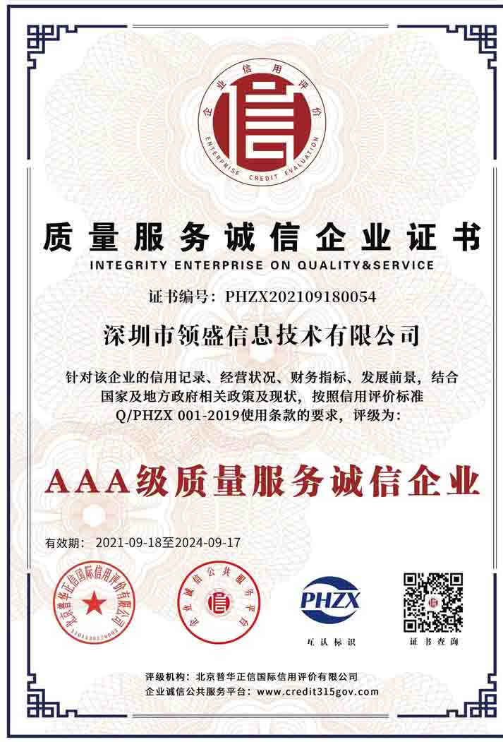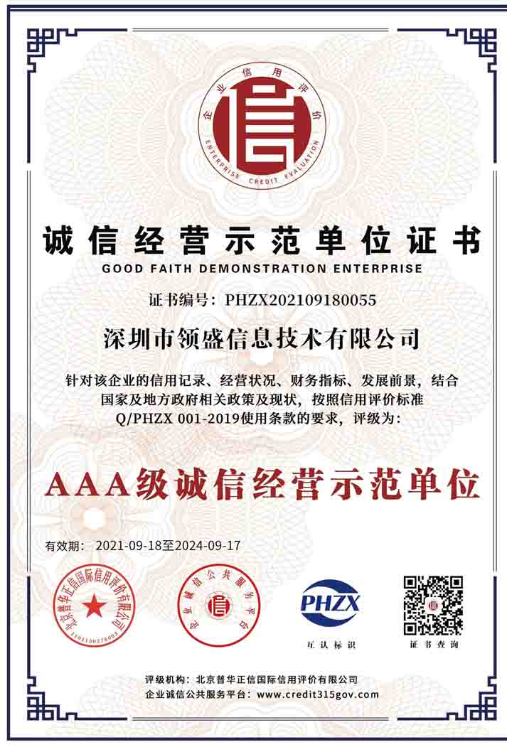[公司资质] 领盛信息顺利通过AAA级诚信经营示范单位 日期:点击:0