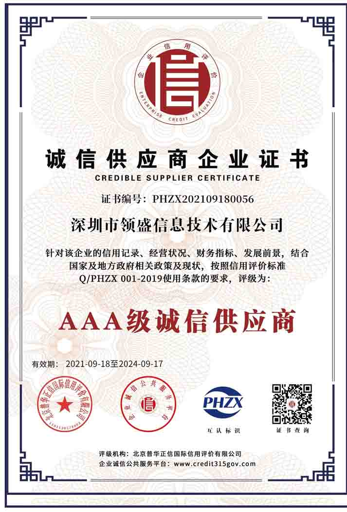 [公司资质] 领盛信息-获得AAA级诚信供应商企业证书 日期:点击:0