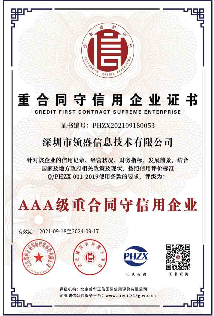 [公司资质] 领盛信息顺利通过重合同守信用AAA级资质 日期:点击:0