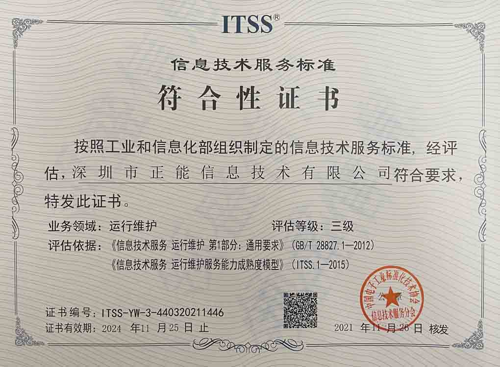 祝贺正能信息顺利通过ITSS认证三级(运行维护模型)