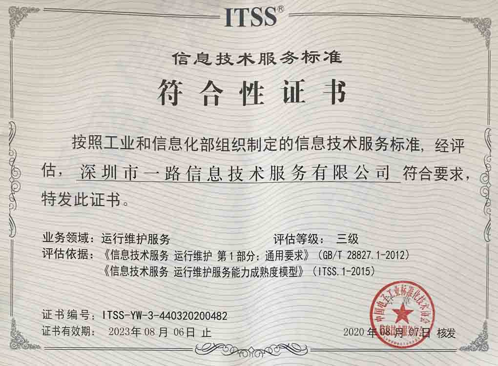 深圳市一路信息技术服务有限公司顺利通过ITSS认证资质三级!
