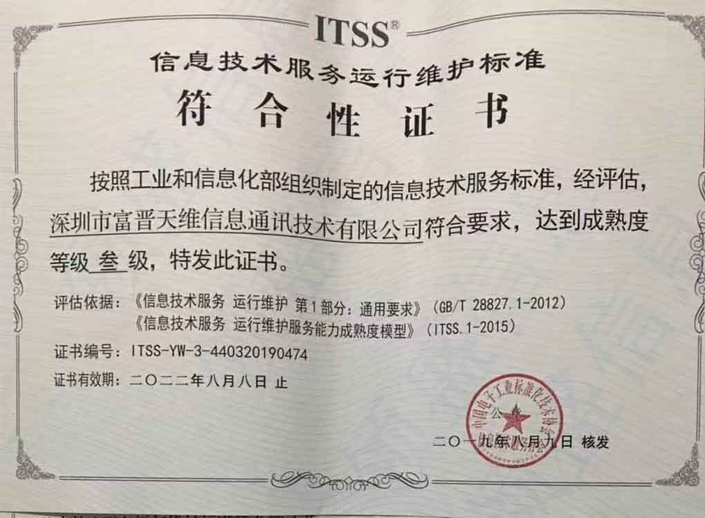 热烈祝贺富晋天维顺利通过ITSS认证三级(运行维护模型)