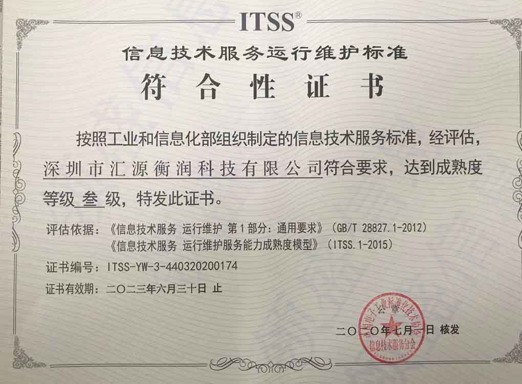 祝贺深圳市汇源衡润科技有限公司顺利通过ITSS认证三级(运行维护模型)