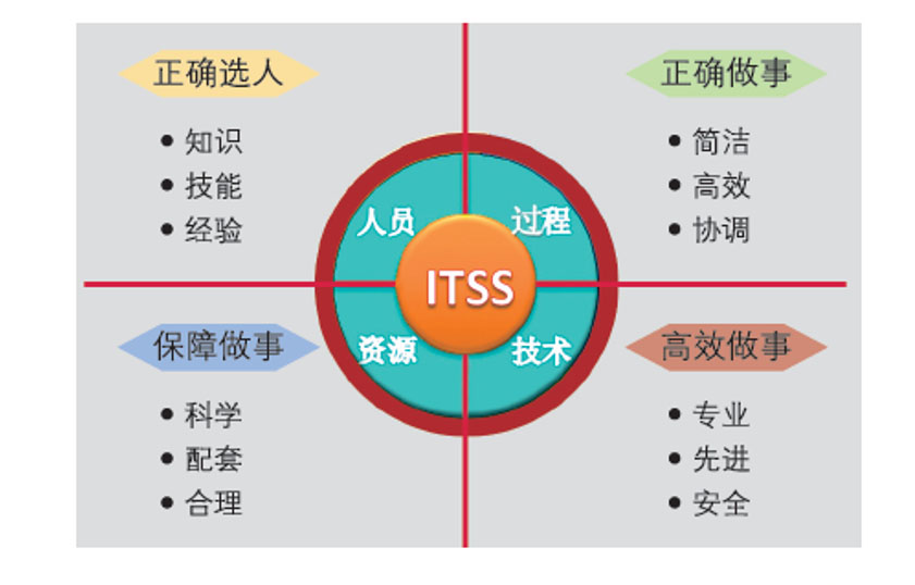 以客户为中心,根据ITSS标准规划设计公司的人员、技术、流程、资源四大组成要素进行规划。人员职位和职能分配:项目经理、项目负责人、 技术组长、IT服务人员等。规定好相对应的职能。技术:相对应的知识和技能,合理利用。流程“制定相关的IT服务流程,进行标准化的作业。资源:合理分配资源,为IT服务提供支持,建立资源库。